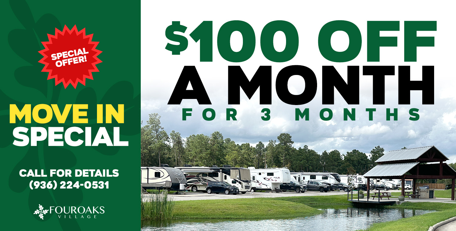 Our rates are daily, weekly, and monthly. Please call 936-224-0531 to make your reservations at Four Oaks Village RV Park. We have an amazing RV Park waiting just for you.